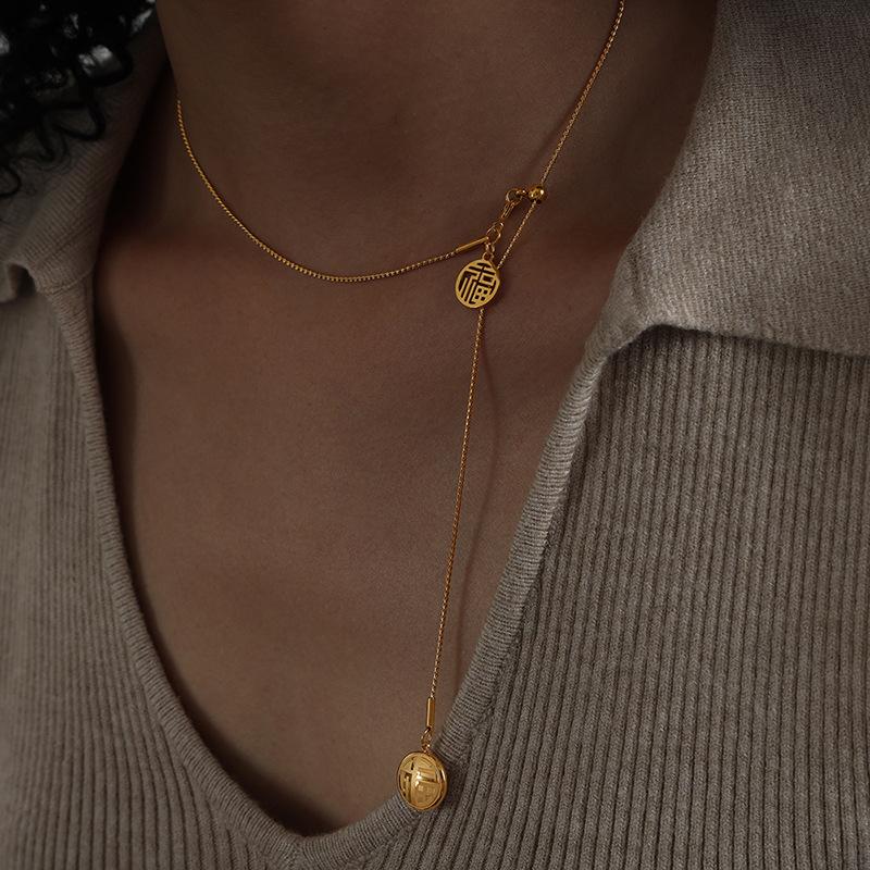 Stainless Steel Chain Necklace For Women 18k Gold Plated Non Tarnish Adjustable Women's Necklaces With Chinese Character Pendant