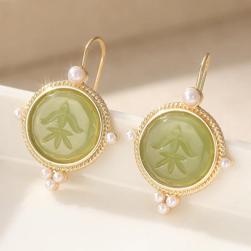 Retro Okrągłe Drukowane Kolczyki wiszące z syntetycznym szmaragdem dla Kobiet Eleganckie Wykwintne Kolczyki wiszące z imitacją perły Biżuteria Prezenty