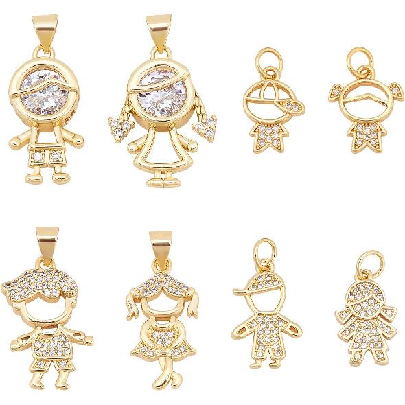 SUPERFINDINGS 8 Styles Girl or Boy Charms Beads Micro Pave Clear Cubic Zirconia Charms Golden Crystal Boy Girl Pendants for Bracelets Earrings
