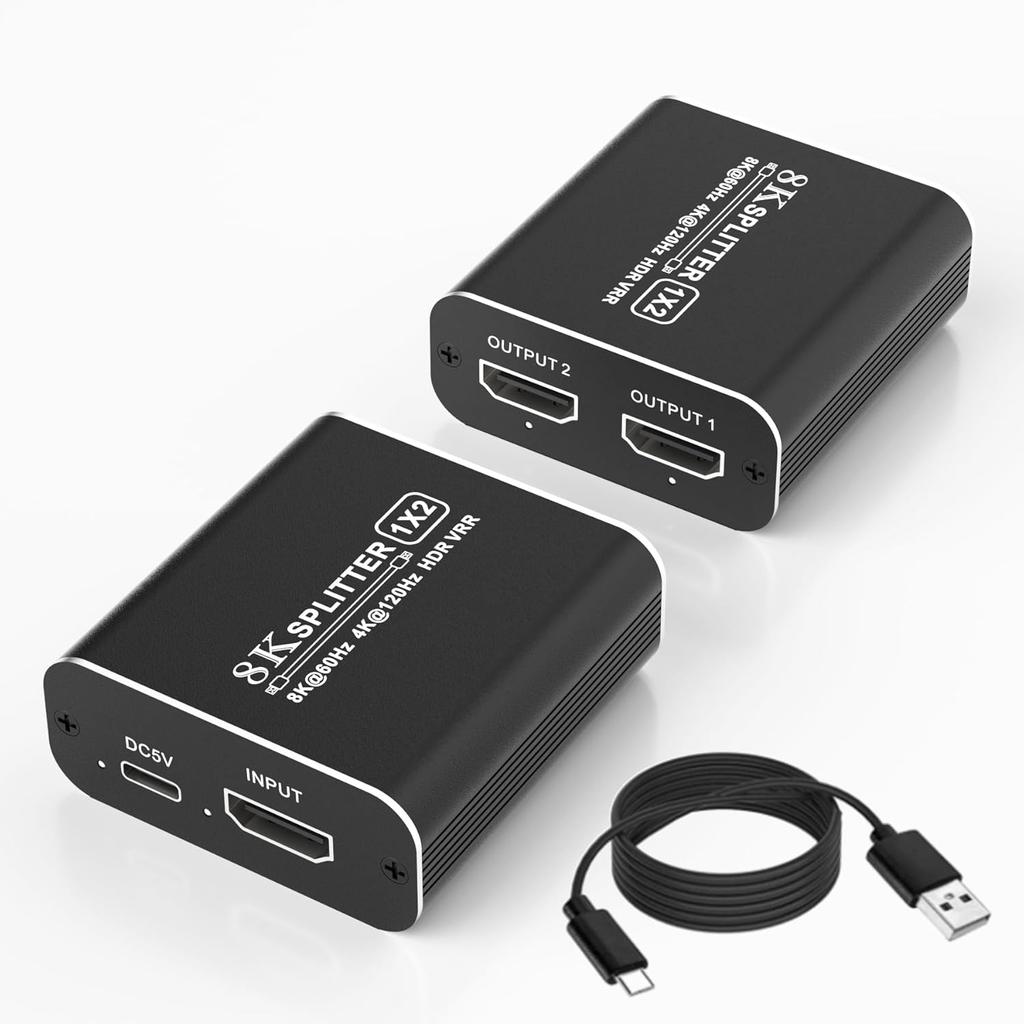 WHAT YOU GET: The high quality aluminum metal enclosure protects the insides and keeps the unit cool by aiding in quick heat absorption and dissipation. Package contents: 8K HDMI 2.1 Splitter (1 in 2 out) x1, DC5V Power Adapter x 1, USB Power Cable x1, User Manual x1