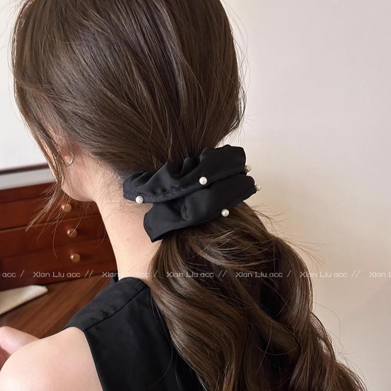 French black velvet pearl pleated large intestine hair band female Internet celebrity retro hair rope rubber band headrope hair accessories