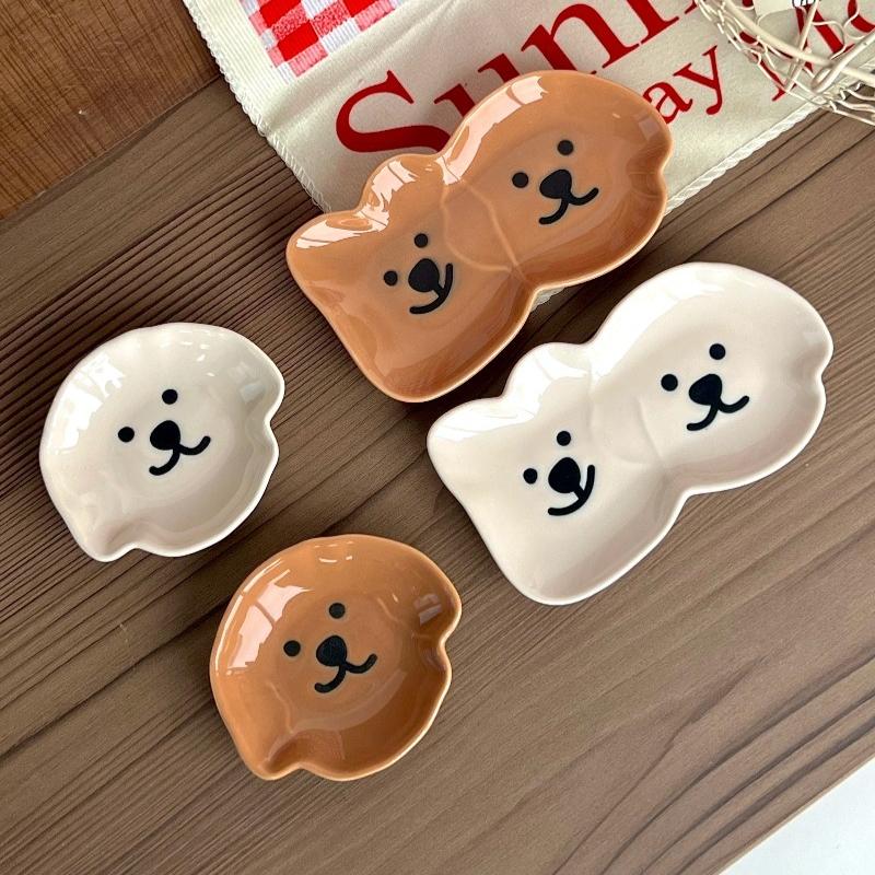 Adorable Ceramic Sauce Dish with Cute Dog & Bear Design - Single/Double Compartment Dip Bowl for Condiments, Snacks, Sushi, Soy