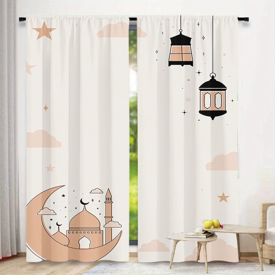 2pcs Pastel Moon Mosque & Lantern Curtains Flat Print Islamic Festival Design Sheer Light-Filtering Fabric Eid Ramadan Window