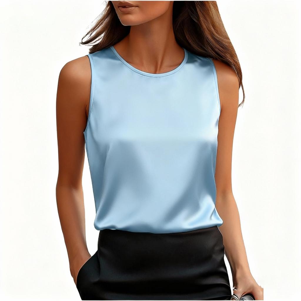 Women's round neck, stylish, casual, solid color satin sleeveless top