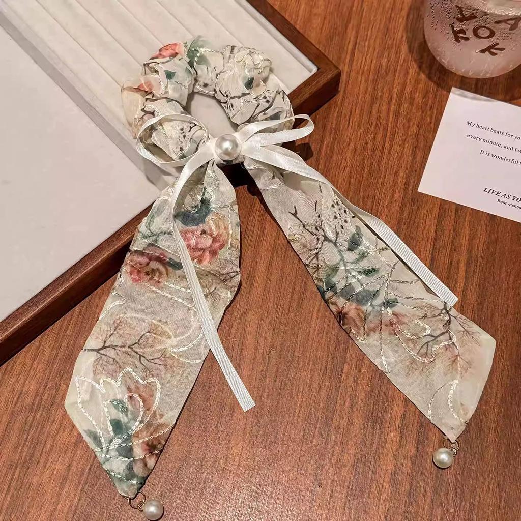 Chinese embroidery floral bow streamer hair band female Korean version pearl tie headrope large intestine hair band