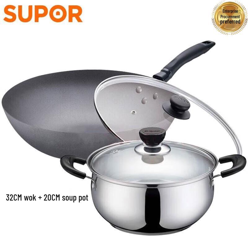SUPOR Cast Iron Wok & Stainless Steel Soup Pot Cookware Set