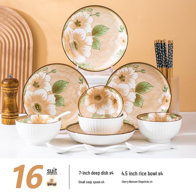 Jingdezhen Ru Han Camellia Underglaze Ceramic 16-Piece Dinnerware Set