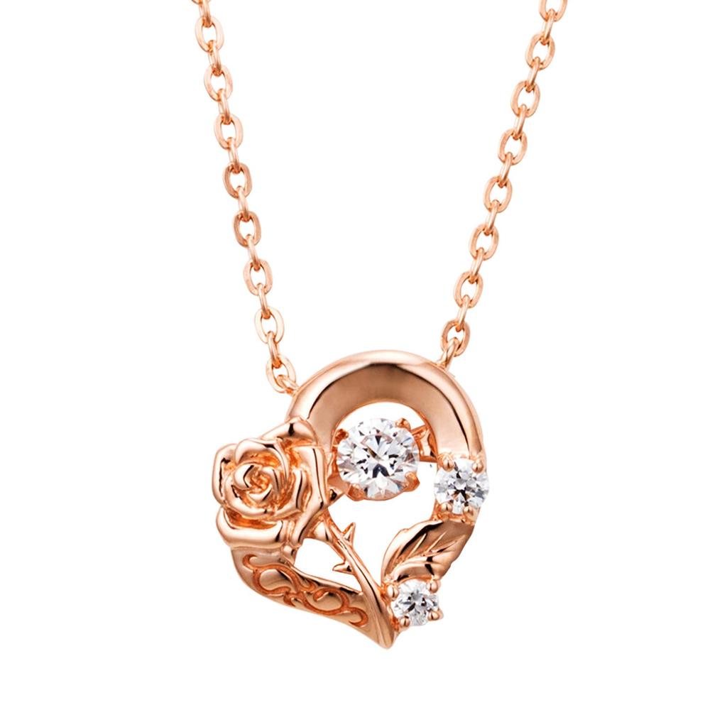 White Clover Beauty and the Beast Dancing Stone Disney Sterling Cubic Pink Necklace, Princess, Silver, Zirconia, Heart, Rose, Gold, DISS008PG, Women's