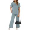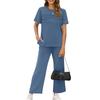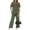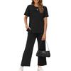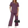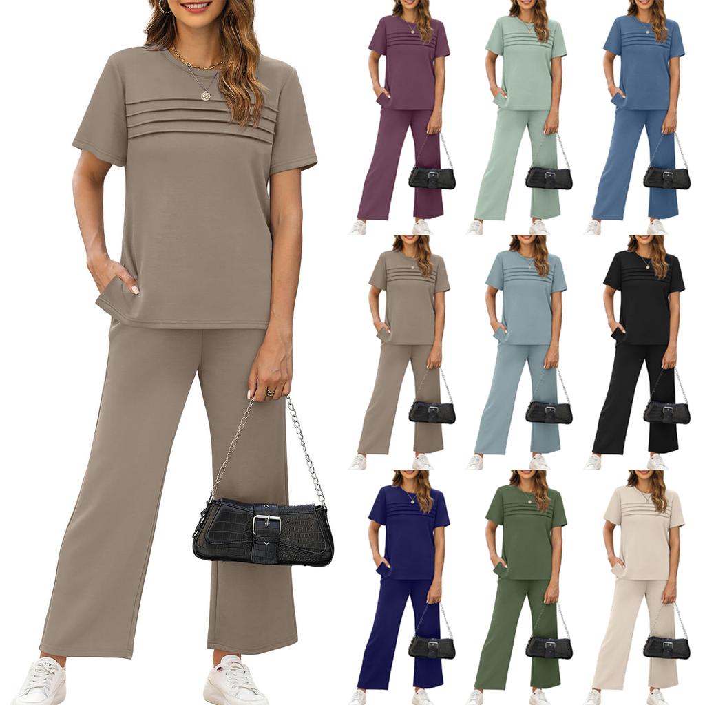 Women's Fashion Color Round Neck Short Sleeved Pleated Top With Drawstring Pockets Casual Pants Sports Two,piece Set