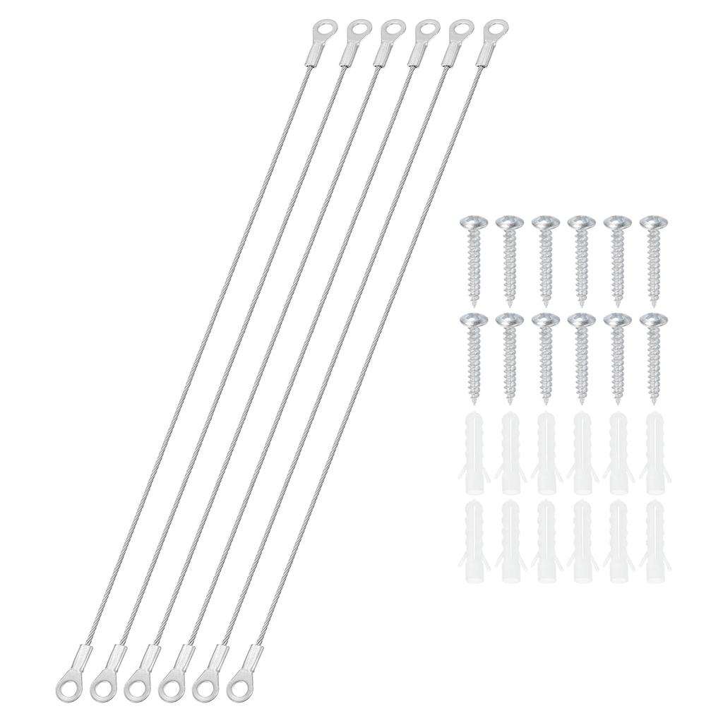 【Specyfikacje produktu】Rozmiar drutu: Średnica 1,5 mm x Długość 30 cm (0,06" x 11,81"), Średnica wewnętrzna oczka: 5mm / 0.2", Zawartość opakowania: 6 lin stalowych z zaplecionymi oczkami, 12 wkrętów samogwintujących, 12 kołków rozporowych