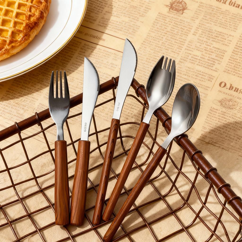 304 Stainless Steel Tableware Set Wood Grain Plastic Handle Knife Fork Spoon Reusable Camping Picnic Cutlery Set Dishwasher Safe