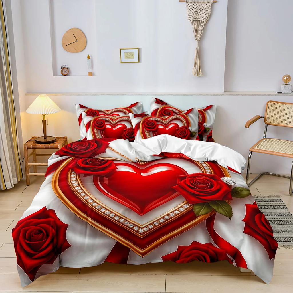 Zestaw pościeli na Walentynki 3 szt. Romantyczny wzór serca i róży Zestaw poszewki na kołdrę dla pary Rozmiar Queen King Prezenty dla ukochanej osoby