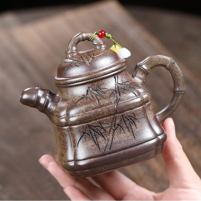 300ml Yixing Purple Clay Teapots Handmade Bamboo Tripod Pot Raw Ore Wood-fired Porcelain Mud Kettle With Filter Zisha Tea Set