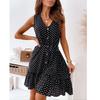 Women's Single-breasted Mid-length Skirt, V-neck Polka Dot Belt, Cinched Waist, Sleeveless Dress
