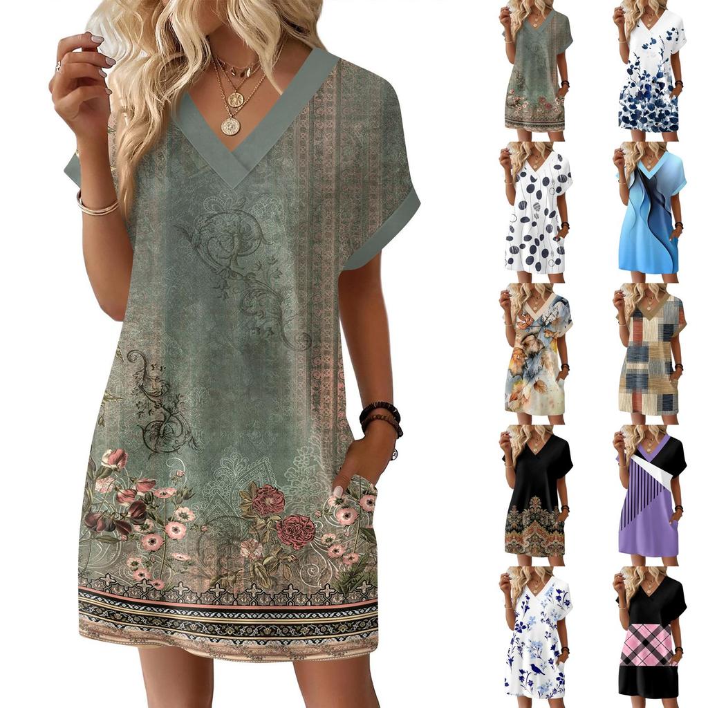 Modna damska sukienka swetrowa z kwiatowym wzorem, dekoltem w serek, krótkim rękawem, kieszenią, codzienna