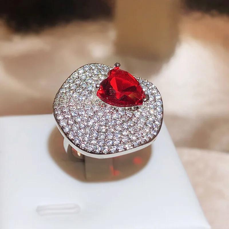 New Lotus Leaf Full Diamond Heart Red Zirconia Ring for Women Fashion Wedding Party Silver Color Jewellery Gift Wholesale