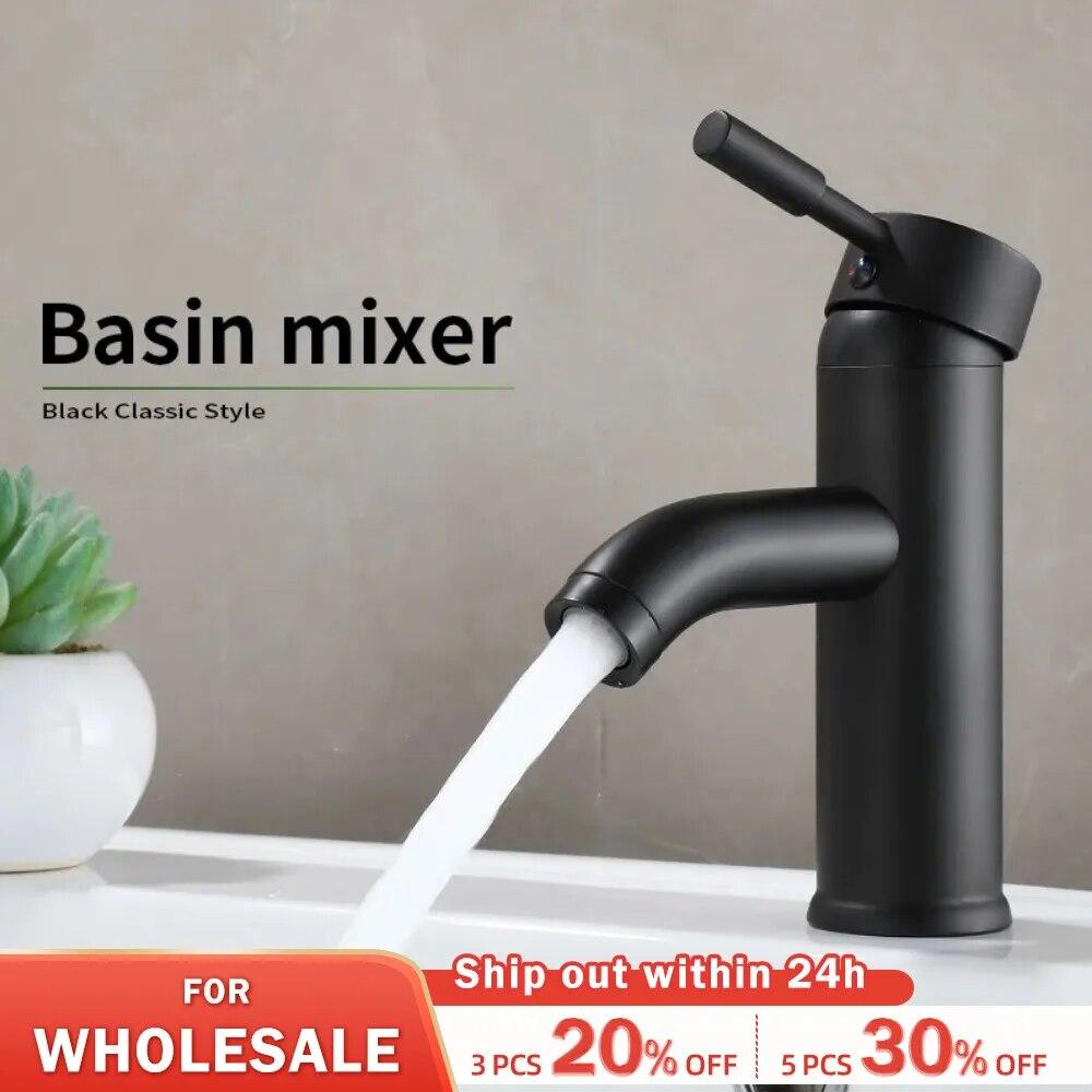Czarny, minimalistyczny styl łazienkowy, bateria zlewozmywakowa z ciepłą i zimną wodą, bateria umywalkowa ze stali nierdzewnej