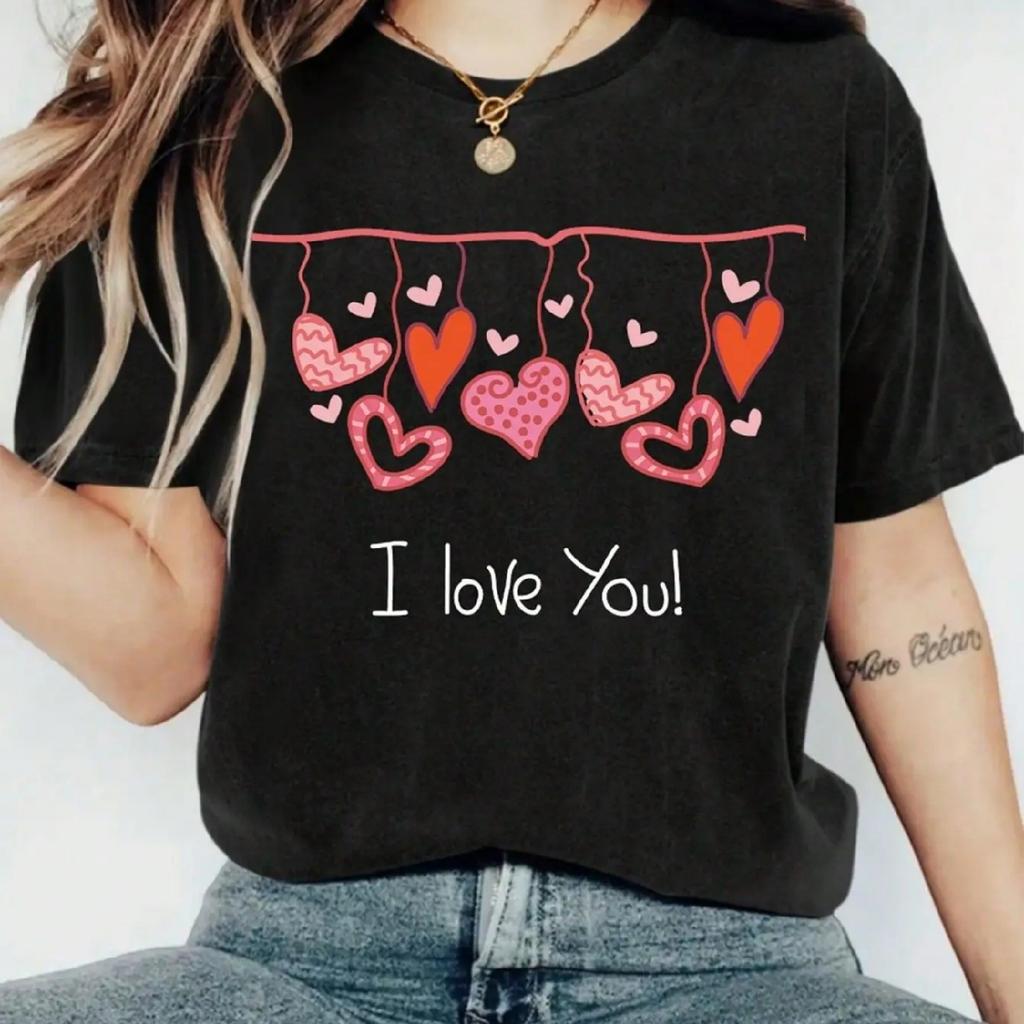 Women's Fashionable I LOVE YOU Letter Print T-Shirt For Valentine's Day - Casual Short Sleeve Crew Neck Top - Lightweight & Brea