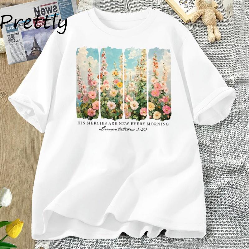 Retro Flower Print Cotton Clothing T-Shirt for Woman Are New Every Morning T Shirt Cozy Tee