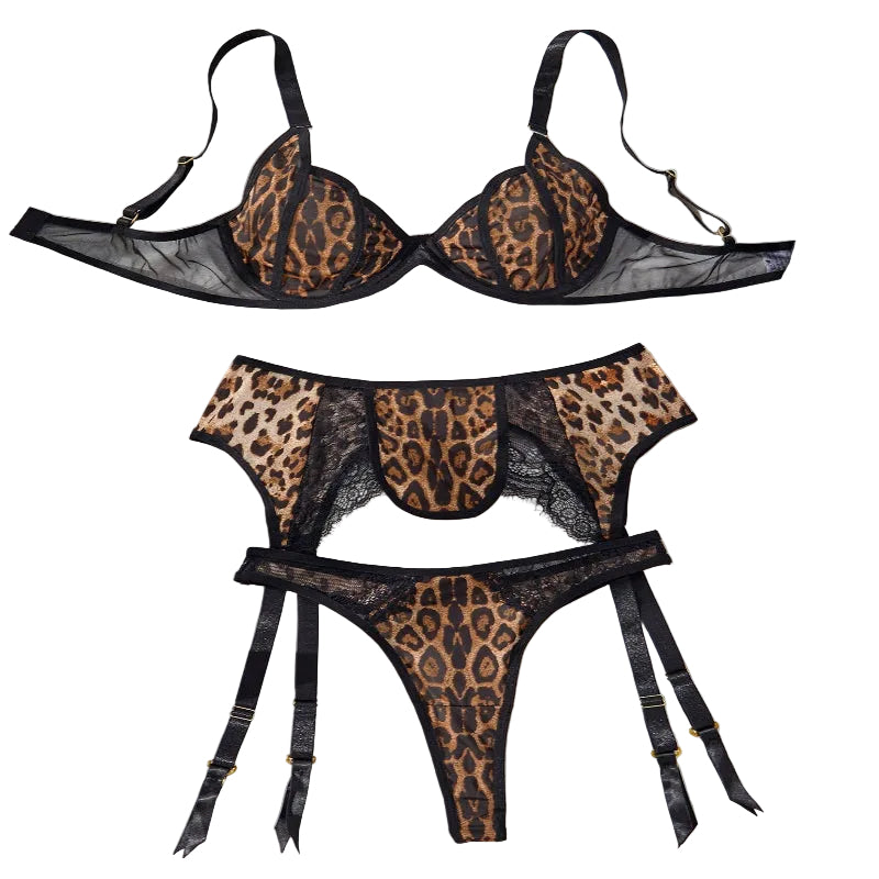 Splicing Leopard Print Set Low Cut Gathering Lingerie Three Piece Set Underwear