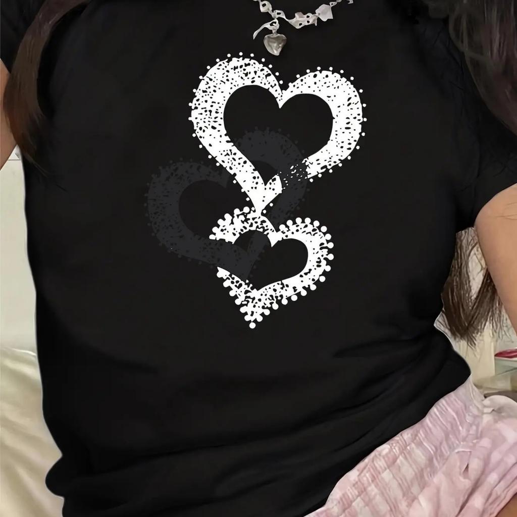 1pc Women'S Casual Round Neck T-Shirt with Heart Print, Polyester Knit Short Sleeve Tee, Summer Regular Fit Top with No Pads or