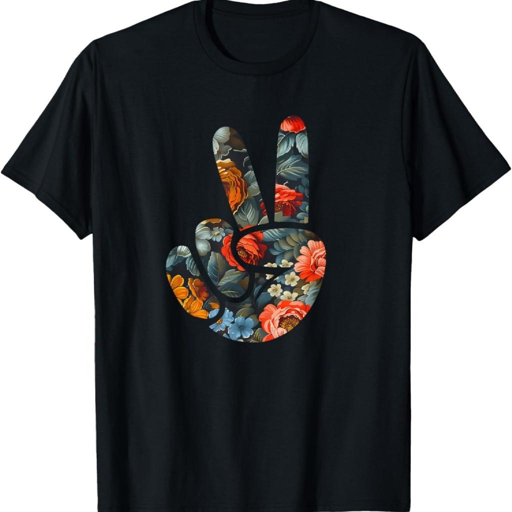 Elegant Silhouette Wildflowers Floral Peace Sign Hand T-Shirt(4)