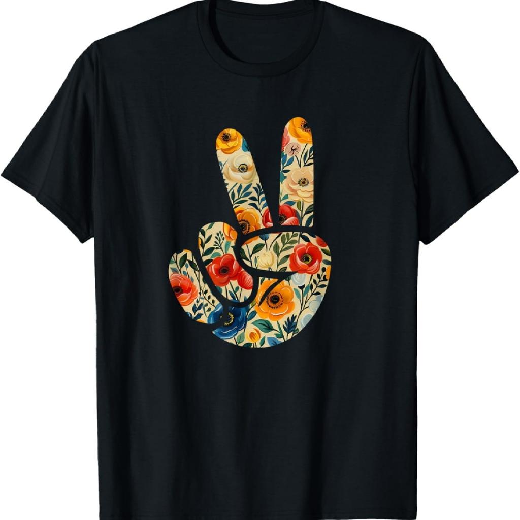 Elegant Silhouette Wildflowers Floral Peace Sign Hand T-Shirt(6)