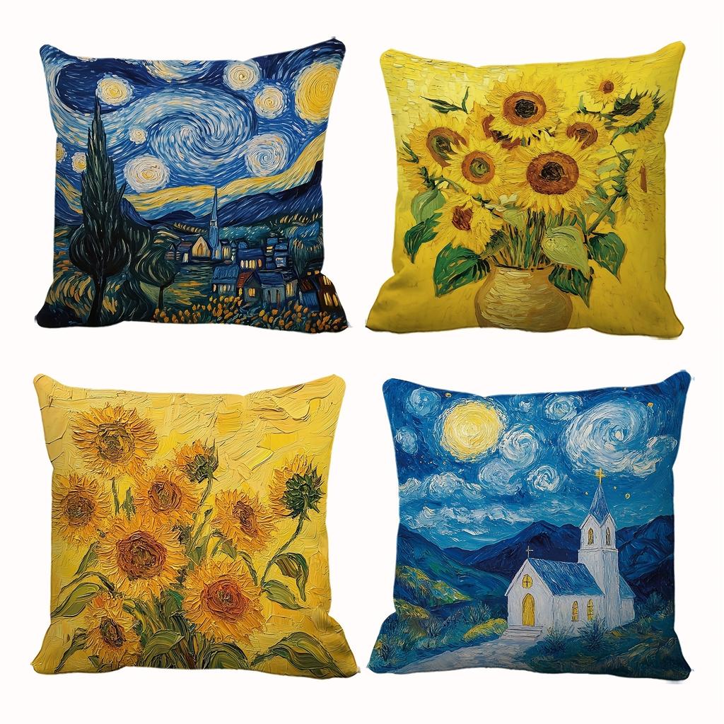 4-Pack Van Gogh Style Pillow Covers, Floral and Landscape Decorative Cushion Cases for Home, Office, Car and Outdoor Decor