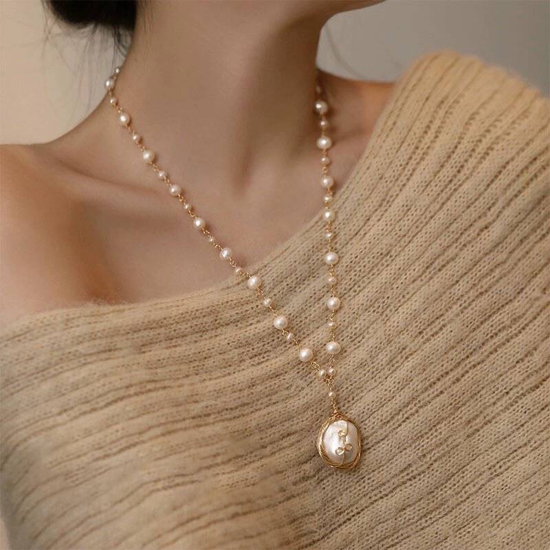 Natural Baroque Pearl Necklace for Women, Hand-woven Long Sweater Chain, Light Luxury and Popular Niche Long Accessories