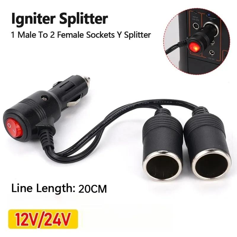 1pcs Universal Car Cigarette Lighter 12-24V Splitter Adapter 1 Male To 2 Female Sockets Y Splitter with On Off Switch 20cm New