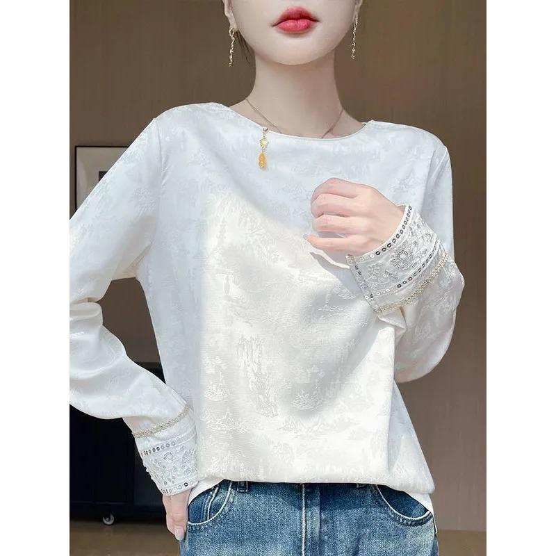 Spring Autumn New Style Satin Round Neck Shirt Women's New Chinese Jacquard Casual Bottoming