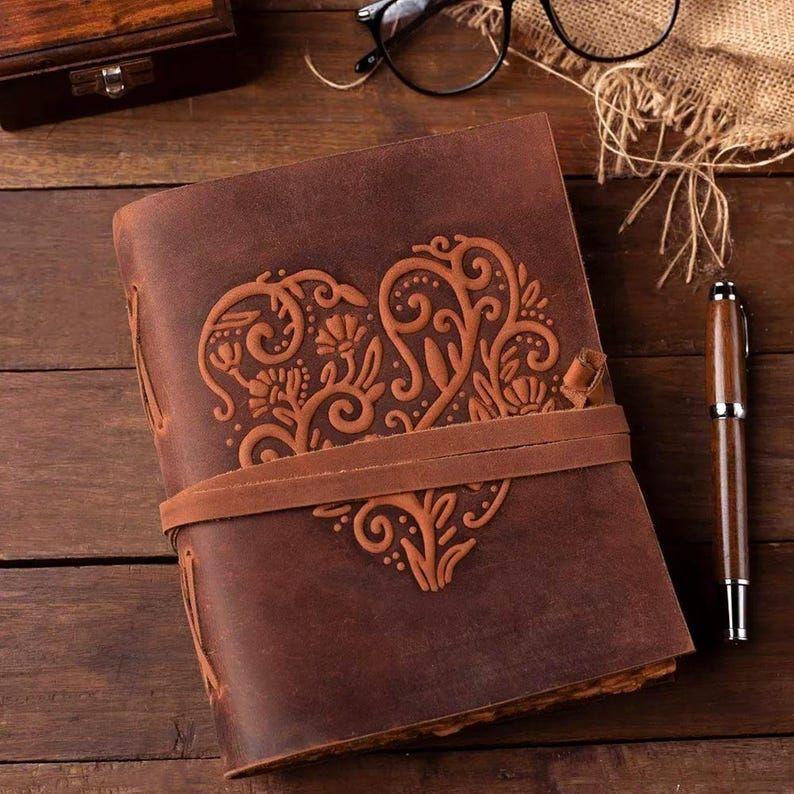 Ręcznie robiony skórzany dziennik z tłoczonym sercem - prawdziwa skóra z papierem, na prezent noworoczny.