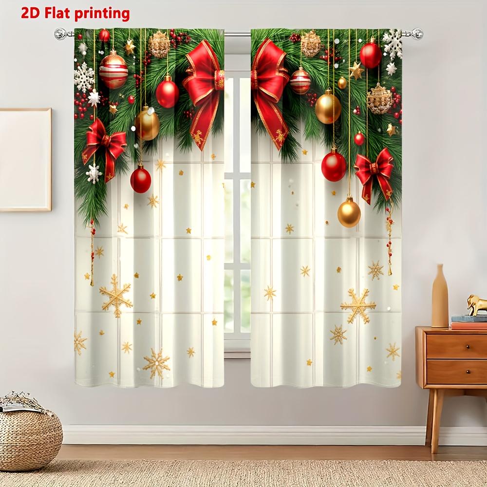 Christmas Pine Bow Curtains 2pcs Golden Ornament Snowflake 2D Flat Print Rod Pocket for Living Room Bedroom Kitchen Privacy