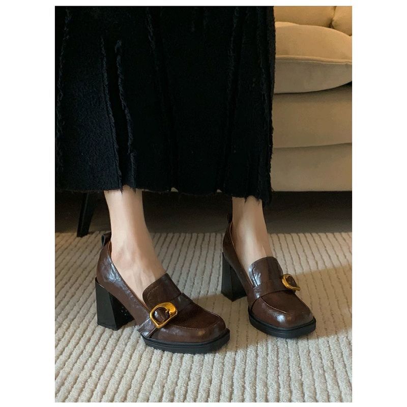 French light mouth thick heel one pedal single shoes women's spring and autumn retro British style square head high heel small leather shoes