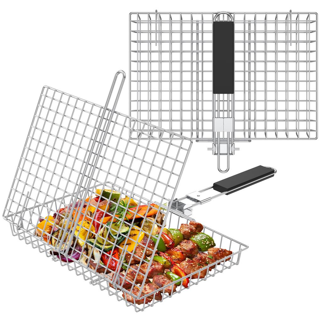 1/2Pcs Grill Basket Folding Portable Stainless Steel BBQ Grill Basket with Handle for Fish Vegetables Shrimp Cooking Accessories