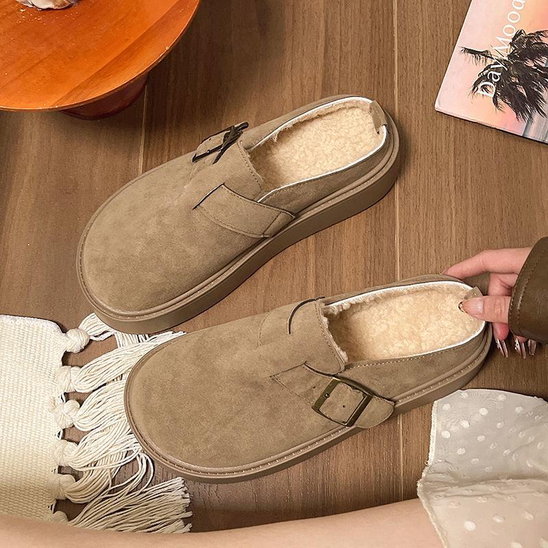 Fleece thick-soled comfortable non-slip Birkenstock slippers one pedal retro bag head half drag women autumn and winter