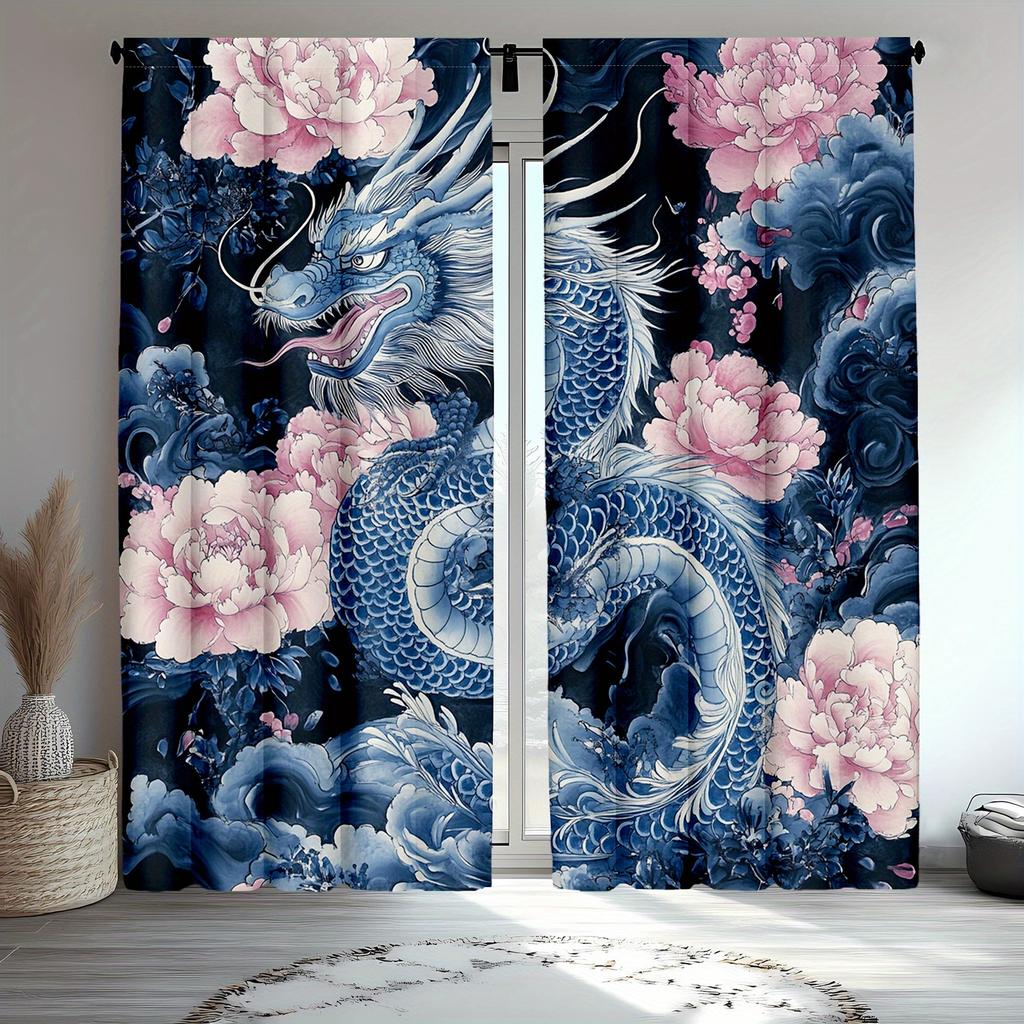 2pcs Japanese Dragon and Flower Curtains Ancient Mythical Creatures Window Drapes