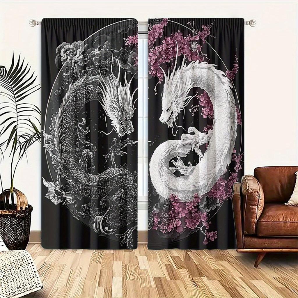 Zasłona Poliestrowa 2szt. Poliestrowa Zasłona Filtrująca Wzór HD Cyfrowy Czarno-Biały Smok do Dekoracji Domu
