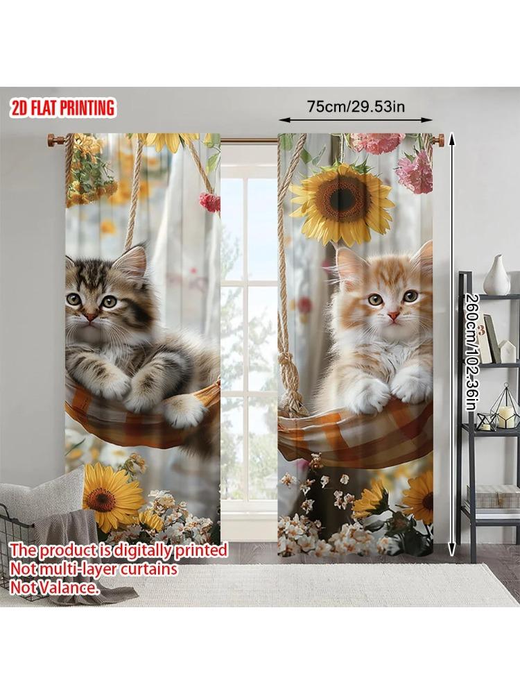 2pcs 2D plane printing Minimalist Curtains Funny Animal Cat Polyester (without rod) Room Decor Use for Living Room & Office