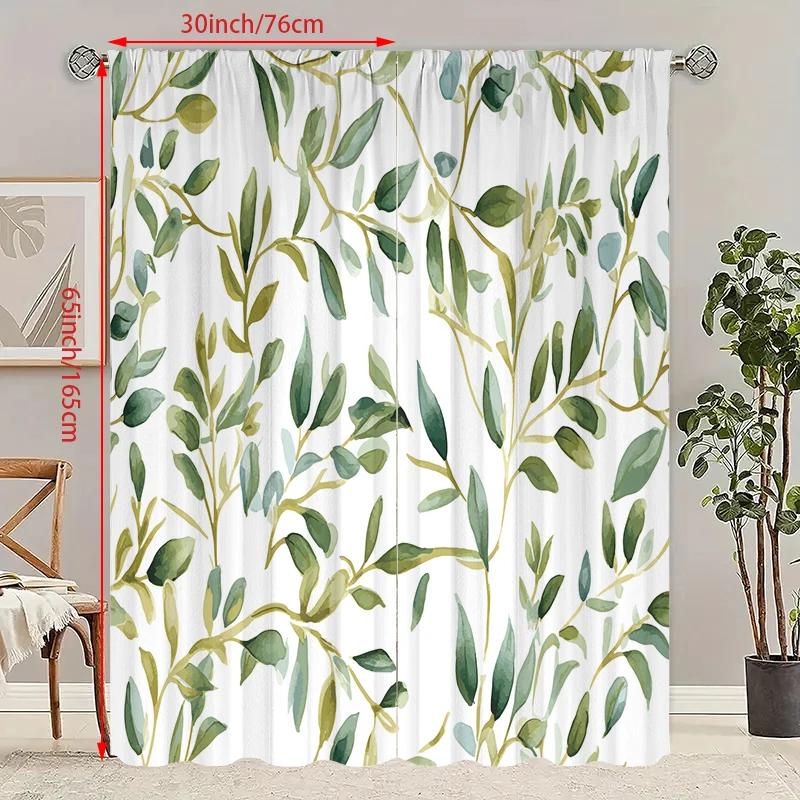 2pcs- Green leaf printed curtain 100% polyester material translucent suitable for bedroom curtains and living room decoration