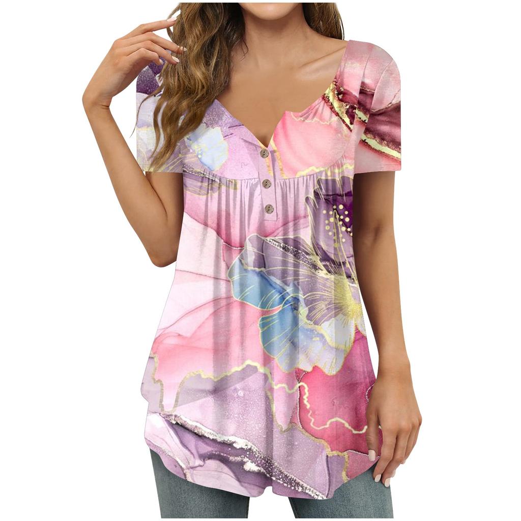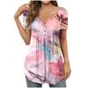 Women's Fashion Floral Printing Pleated Short Sleeve Casual T-shirt Button Top