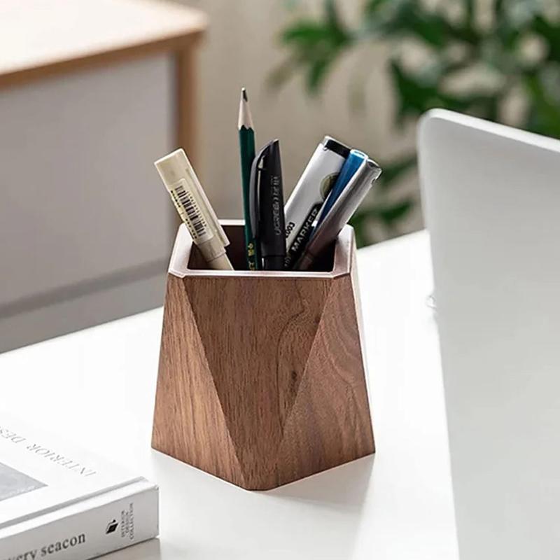 Walnut Geometric Lines Desktop Storage Pen Holders Large Capacity Pen Holder Box Nordic Style Business Pencil Organizer
