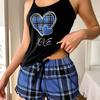 Damski piżamowy komplet z krótkim rękawem i szortami w serca i kratę