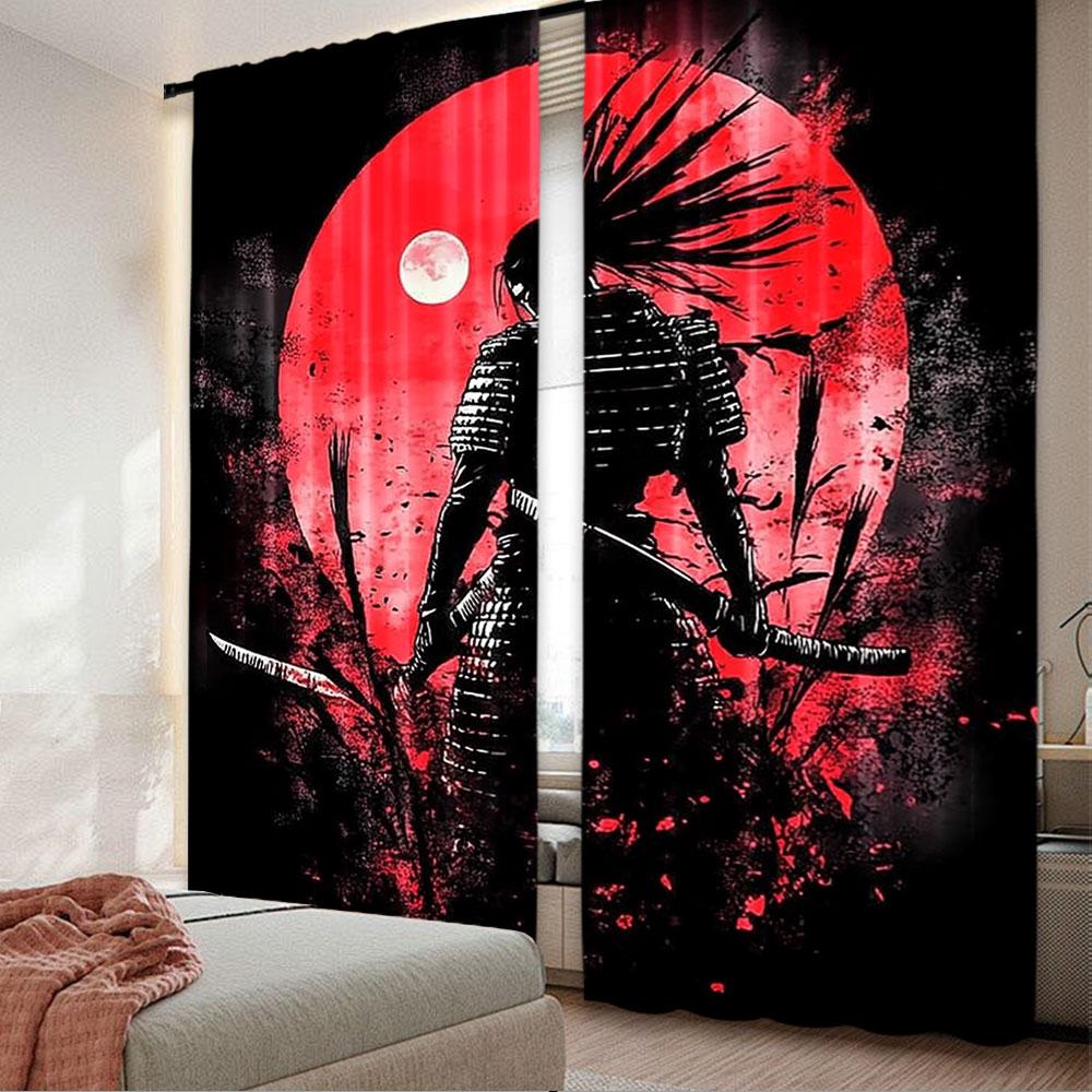 2Pcs Anime Samurai Curtain Cool Japanese Black And Red Art Curtain For Bedroom Asian Chinese Red Sun Curtain For College Dorm