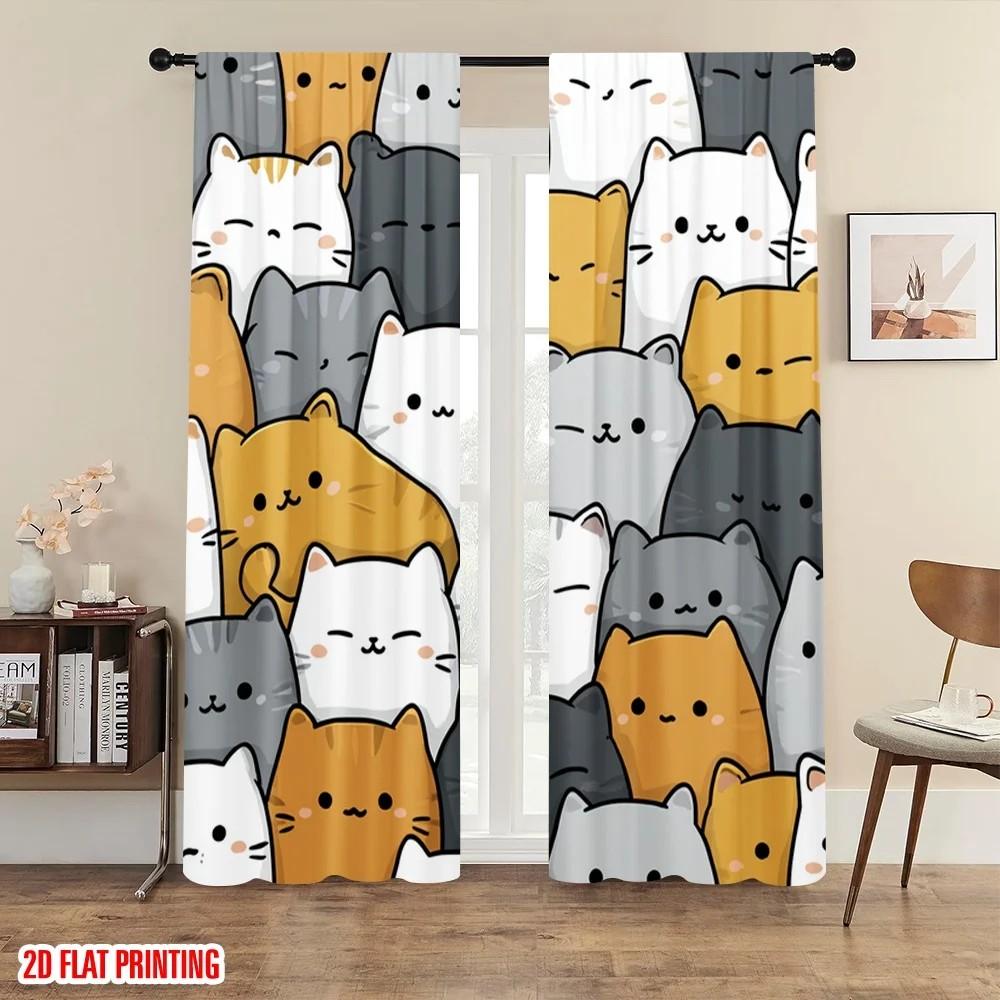 JIT 2pcs Cute Kitten Printed Curtains Design Drapes Shading Polyester Window Treatments for Kids Room Home Decor Rod Pocket
