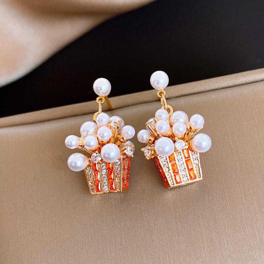 18K real gold electroplated silver needle zircon flower basket fireworks pearl stud earrings exquisite earrings women