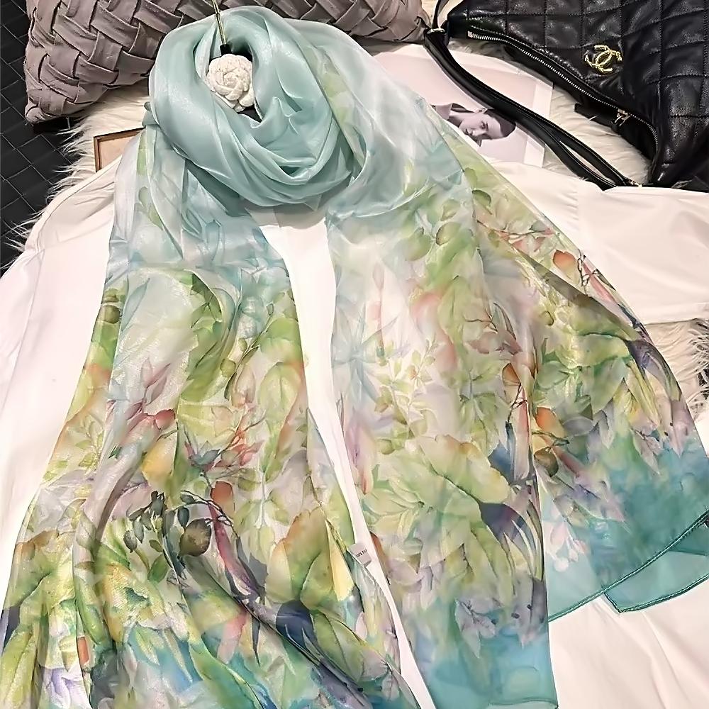 Blue Green 100% Silk Shawl Scarf Women Fashion New Floral Design Long Scarves Wraps Summer Chiffon Beach Scarf Wrap 180*110Cm
