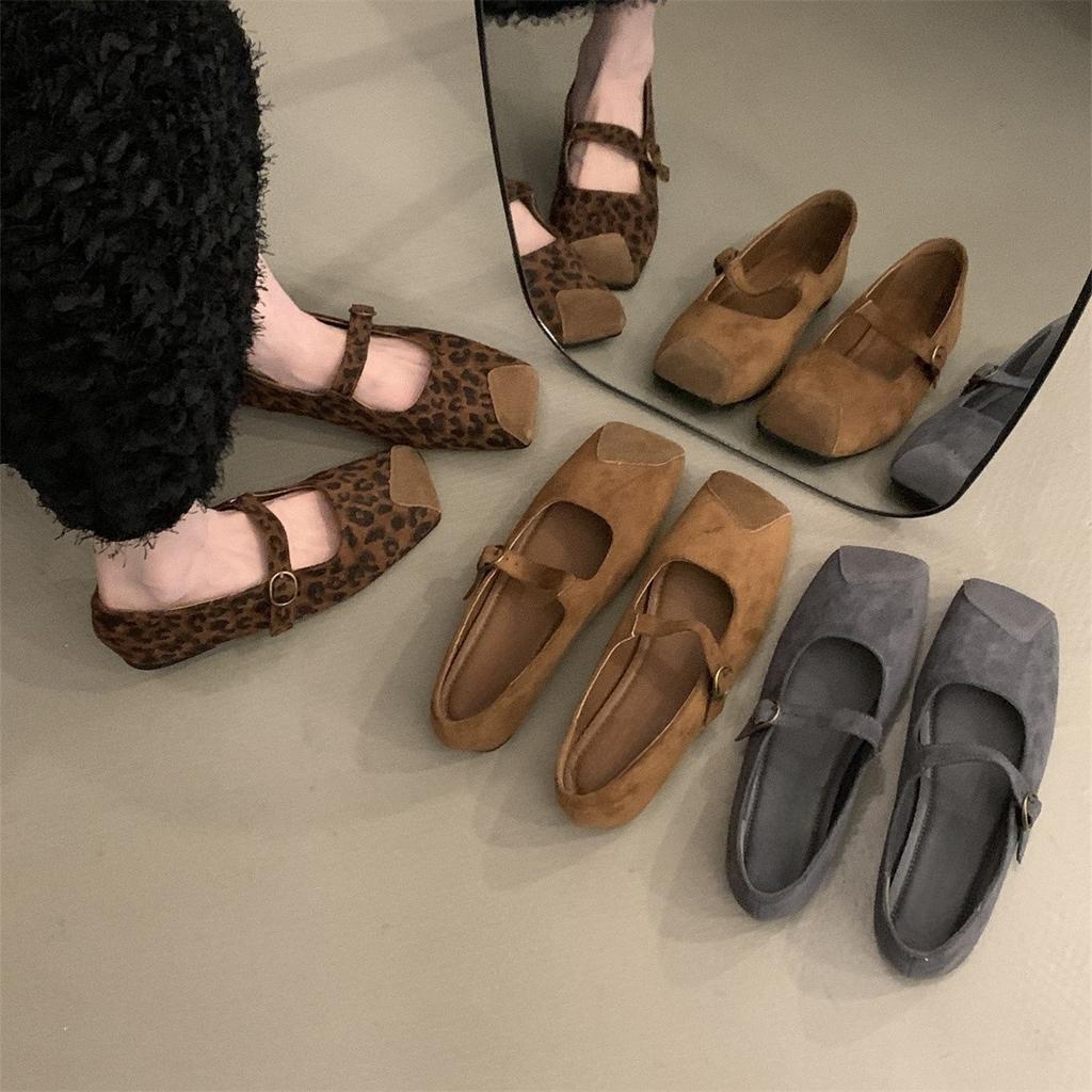 Flat-bottomed retro Mary Jane shoes women's shoes spring and autumn design sense leopard print light mouth square head single shoes