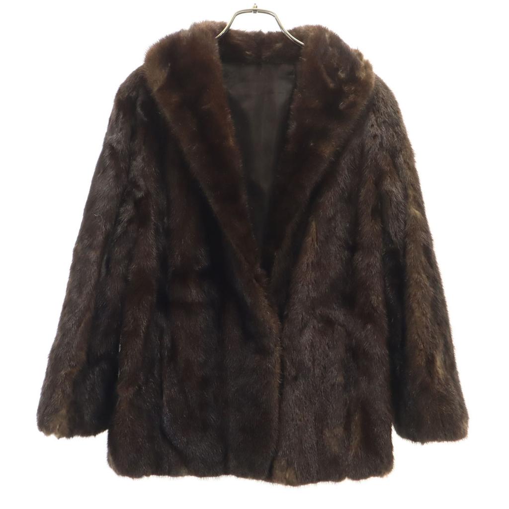 The size and material are unknown. Please refer to the actual measurements. There is fraying in the lining, fur at the hem and cuffs, and one side of the top fastener is missing. Please understand that this is a used item before purchasing.