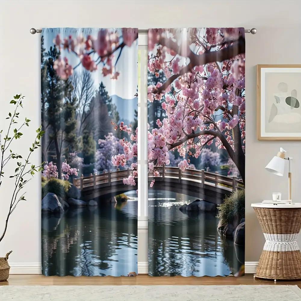 2 szt. Zasłony Jezioro Sakura Most - Poliester Spokojny Malowniczy Kwitnące Drzewa Idealne do Sypialni - Estetyka Jeziorna